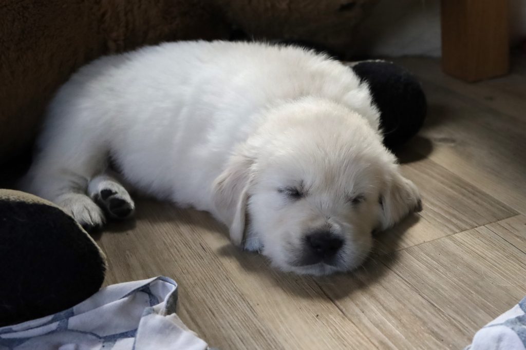 Auch kulinarisch haben wir aufgestockt: vier Mahlzeiten am Tag zusätzlich zur Muttermilch. Kein Wunder also, dass die Bäuchlein kugelrund und die Pfoten ständig in Bewegung sind.